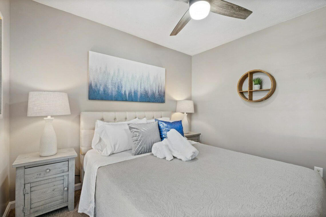 A private suite in the second bedroom offers a queen-sized bed and an ensuite bathroom with a shower/tub combo.